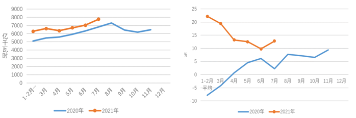 1-7月份,全國工業(yè)用電量同比增長15.2%,增速同比提高17.4個百分點。全國制造業(yè)用電量同比增長16.8%,增速同比提高18.7個百分點。制造業(yè)中,四大高載能行業(yè)合計用電量同比增長12.5%,其中,建材行業(yè)同比增長17.1%,黑色行業(yè)同比增長14.5%,化工行業(yè)同比增長11.4%,有色行業(yè)用電量同比增長9.0%;高技術及裝備制造業(yè)合計用電同比增長24.7%,其中,電氣機械和器材制造業(yè)、汽車制造業(yè)、儀器儀表制造業(yè)、通用設備制造業(yè)、計算機/通信和其他電子設備制造業(yè)、專用設備制造業(yè)、金屬制品業(yè)同比增長超過20%,分別為33.3%、29.9%、28.9%、27.5%、27.1%、22.0%和20.3%;消費品制造業(yè)合計用電同比增長20.3%,其中,家具制造業(yè)、文教/工美/體育和娛樂用品制造業(yè)、紡織服裝/服飾業(yè)、木材加工和木/竹/藤/棕/草制品業(yè)、皮革/毛皮/羽毛及其制品和制鞋業(yè)、紡織業(yè)、印刷和記錄媒介復制業(yè)同比增長超過20%,分別為31.4%、27.4%、27.3%、26.3%、25.4%、25.3%和21.3%。