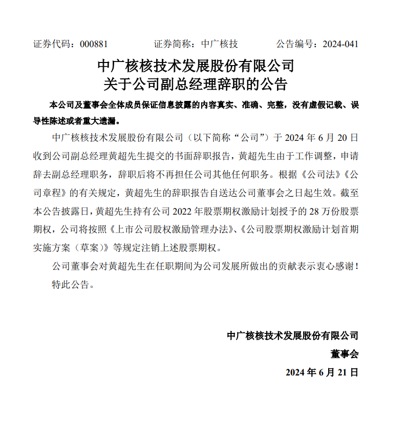 黃超辭去中廣核核技術(shù)發(fā)展股份有限公司(以下簡稱“中廣核技”)副總經(jīng)理職務(wù)。
