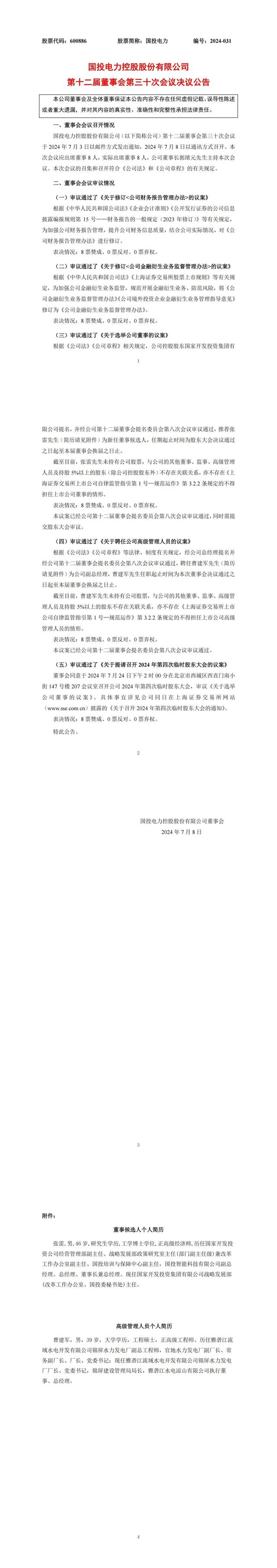 7月8日,國投電力召開董事會,審議通過了《關于聘任公司高級管理人員的議案》,聘任曹建軍先生為公司副總經理,曹建軍先生任職起止時間為本次董事會決議通過之日起至本屆董事會換屆之日止;推薦張雷為新任董事候選人。