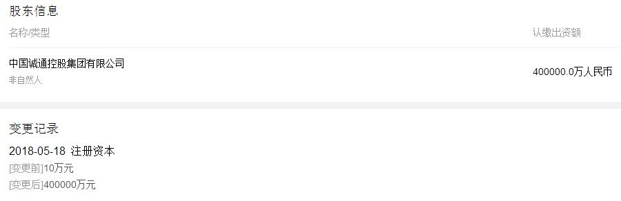 誠通集團是國資委首批中央企業建立和完善國有獨資公司董事會試點企業和國有資產經營公司試點企業。列2009中國企業500強第187名,2009中國服務業企業500強第62名,2008中國物流、倉儲、運輸、配送服務業第3名。北京誠通金控是中國誠通集團的全資子公司,成立于2015年,在今年5月份剛剛將注冊資本由10萬元變更為40億元。