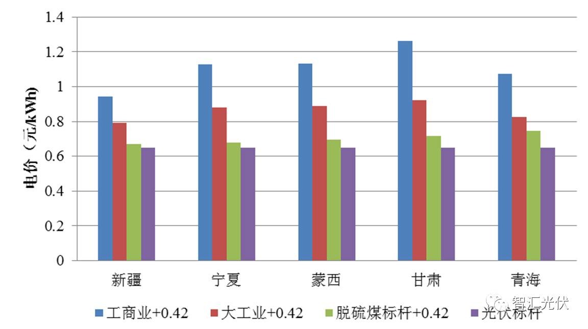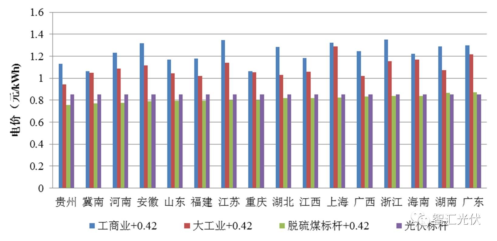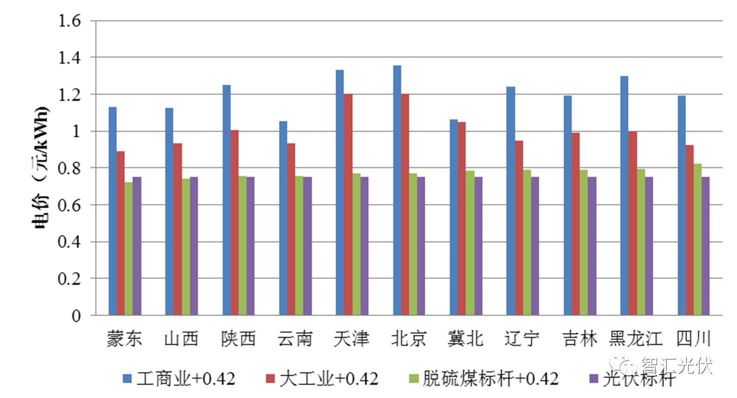 可以看出: “工商業+0.42”比0.65元/kWh高0.29~0.61元/kWh “大工業+0.42”比0.65元/kWh高0.14~0.27元/kWh 脫硫煤+0.42”比0.65元/kWh高0.02~0.095元/kWh 即在Ⅰ 類資源區,無論是在工商業屋頂,還是大工業屋頂,“自發自用電價”、“余電上網電價“均高于當地的“全額上網”標桿電價0.65元/kWh。