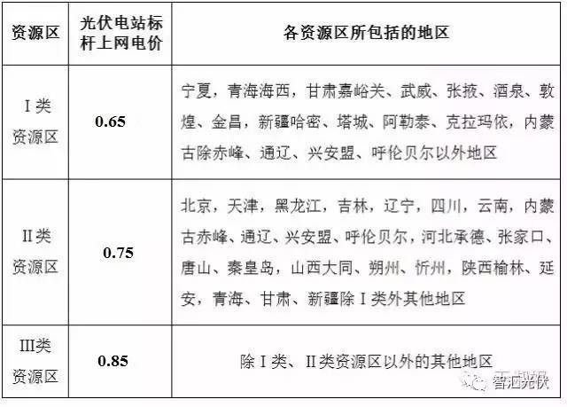 全國分為三類電價區,光伏標桿電價分別為0.65元/kWh、0.75元/kWh、0.85元/kWh。