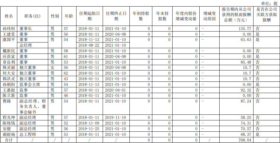 浙江浙能電力股份有限公司企業負責人2019年度薪酬情況