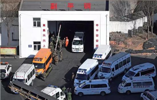 百吉礦業李家溝煤礦,位于生產調度中心大樓旁的“副平硐”,礦工們平時就是從此處進入礦井中作業。1 月13日, 事故發生后的井口,停滿了救援車輛。
