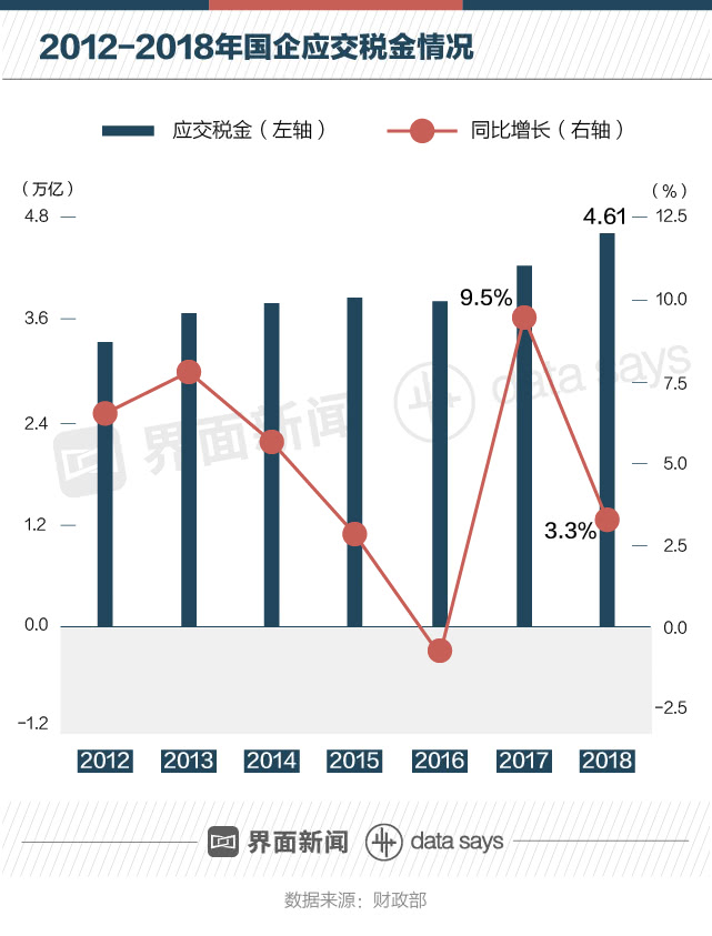 據財政部數據,2012年至2018年國企應交稅金總體呈上漲態勢。2018年應交稅金達4.61萬億,創歷史新高,但2016年曾出現過一次負增長。