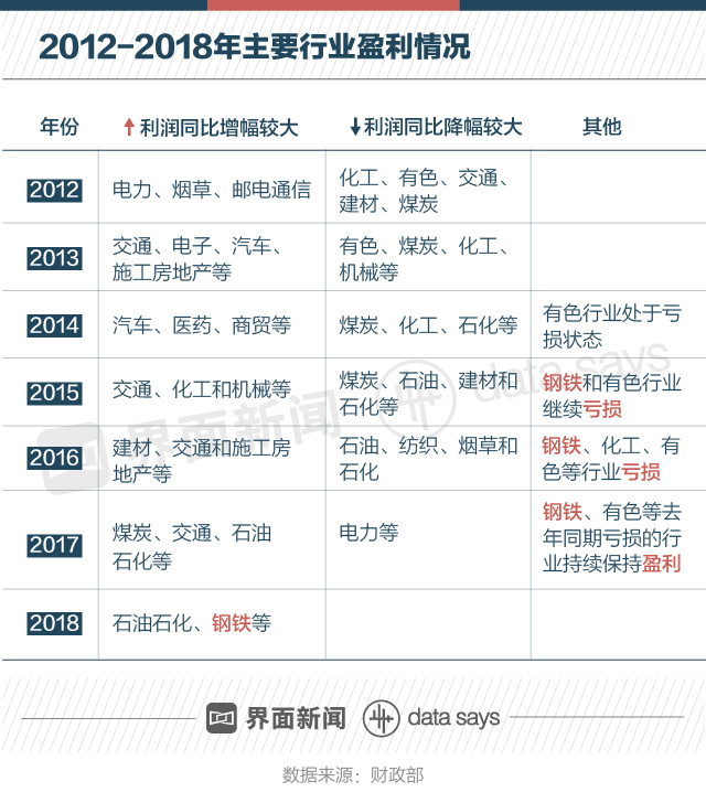 從盈利行業情況來看,2018年,財政部報告中所列利潤同比增幅較大行業僅有石油石化、鋼鐵2個。