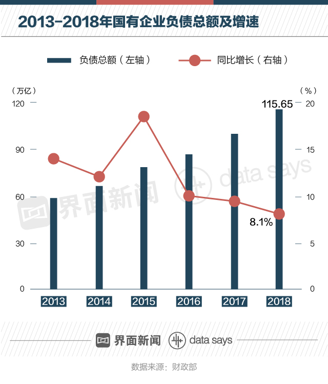 從同比增速情況來看,國有企業負債總額增速在2015年達到峰值18.5%后,開始逐年放緩。2018年,國有企業負債總額同比增速僅為8.1%。