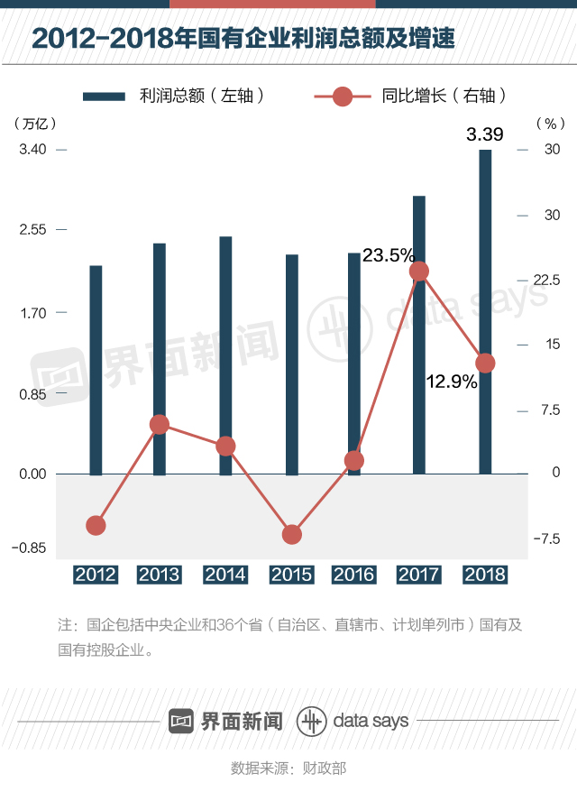 財政部數據顯示,2012年以來,國有企業利潤額總體保持增長勢頭。2015年國企利潤總額小幅下跌后,在2016年開始回升,并在2017年實現大幅反彈。2018年國企利潤總額達3.39萬億,創歷史新高。