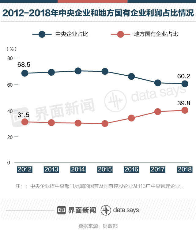 分企業類型來看,2012年至2018年,中央企業在全年利潤總額中的占比由68.5%降至60.2%,但其利潤仍占主導。同時,地方國有企業利潤占比提升明顯,2018年達到39.8%,比2012年增加了8.3%,央企與地方國企在利潤總額中的占比差距逐漸縮小。
