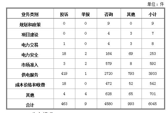 投訴舉報主要集中在電力行業,共472件。從業務分類情況看,電力交易方面1件,占0.21%;電力安全方面20件,占4.24%;市場準入方面5件,占1.06%;供電服務方面420件,占88.98%;成本價格和收費方面18件,占3.81%;其他方面8件,占1.69%。(2018年1月電力行業有效信息按業務分類情況見表二)