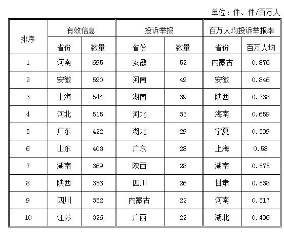 2018年1月,各?。ㄗ灾螀^、直轄市)按照有效信息數量排序,河南、安徽、上海等?。ㄊ校┝腥珖?0位;按照投訴舉報數量排序,安徽、河南、湖南等省排在全國前10位;按照百萬人均投訴舉報率排序,內蒙古、安徽、陜西等?。ㄗ灾螀^)位于全國前10位。(2018年1月有效信息及投訴舉報排名前10位情況見表三)