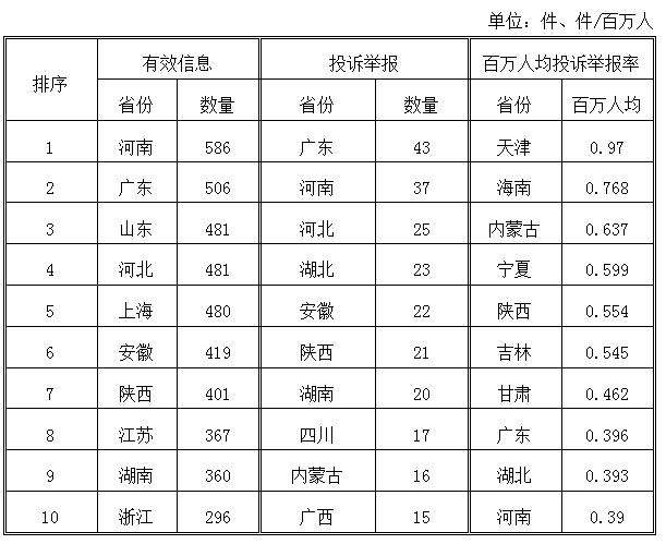 2018年5月,各省(自治區(qū)、直轄市)按照有效信息數(shù)量排序,河南、廣東、山東、河北等省列全國前10位;按照投訴舉報數(shù)量排序,廣東、河南、河北等省排在全國前10位;按照百萬人均投訴舉報率排序,天津、海南、內蒙古等省(市、自治區(qū))位于全國前10位。(2018年5月有效信息及投訴舉報排名前10位情況見表三)
