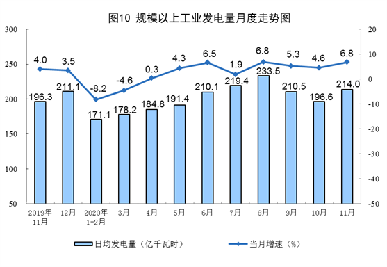 電力生產明顯加快。11月份,發電量6419億千瓦時,同比增長6.8%,增速比上月加快2.2個百分點;日均發電214.0億千瓦時,環比增加17.4億千瓦時。1—11月份,發電量66824億千瓦時,同比增長2.0%。