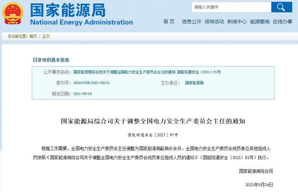 根據工作需要,全國電力安全生產委員會主任調整為國家能源局副局長余兵。全國電力安全生產委員會成員單位其他組成人員按照《國家能源局綜合司關于調整全國電力安全生產委員會成員單位組成人員的通知》(國能綜通安全〔2021〕81號)執行。