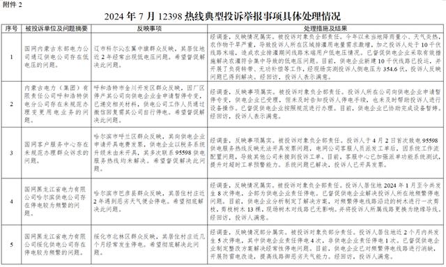 針對群眾反映的投訴舉報,國家能源局派出機構(gòu)嚴格根據(jù)國家有關(guān)法規(guī)政策規(guī)定進行處理。一是督促供電企業(yè)加強臺區(qū)等設(shè)備改造力度,縮短供電半徑,提高電網(wǎng)轉(zhuǎn)供、互供能力,解決故障停電、低電壓等電能質(zhì)量問題;二是要求供電企業(yè)加強設(shè)備隱患排查整治、停電搶修管理,加大線路巡視頻次,及時消除隱患缺陷,增加搶修資源投入,提升設(shè)備管控和停電搶修能力,切實提高供電質(zhì)量;三是通過行政處罰、監(jiān)管約談、責令整改等方式,糾正有關(guān)企業(yè)違法違規(guī)行為,維護公平公正的市場秩序和群眾合法權(quán)益;四是通過解釋說明、澄清事實,消除群眾誤解。(2024年7月12398熱線典型投訴舉報事項具體處理情況,見附件2)