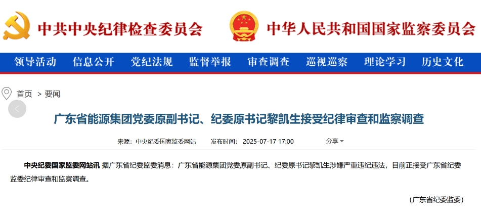 中央紀委國家監委網站7月17日消息,據廣東省紀委監委消息:廣東省能源集團黨委原副書記、紀委原書記黎凱生涉嫌嚴重違紀違法,目前正接受廣東省紀委監委紀律審查和監察調查。