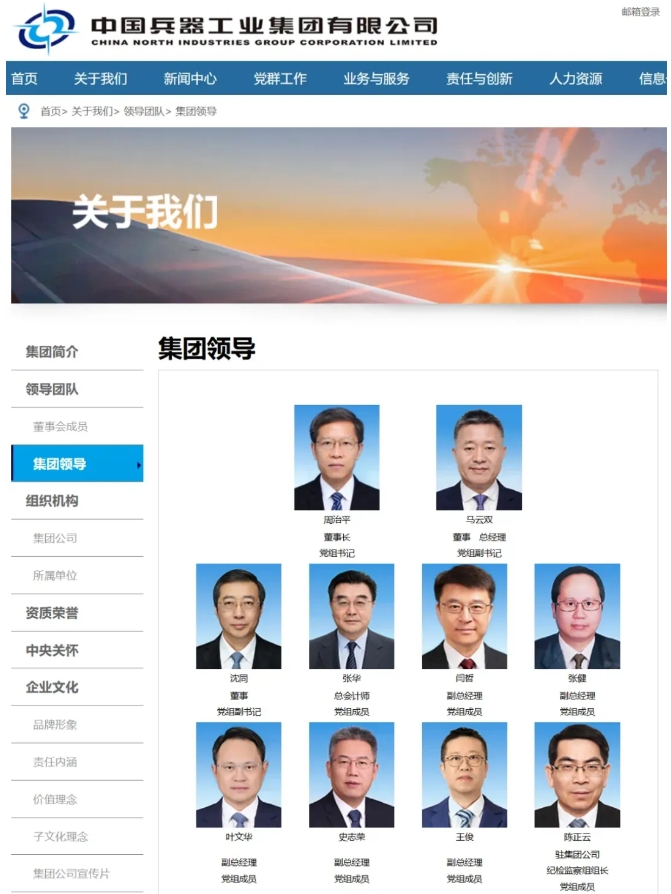 中國兵器工業集團有限公司官網“集團領導”一欄最新信息顯示,沈