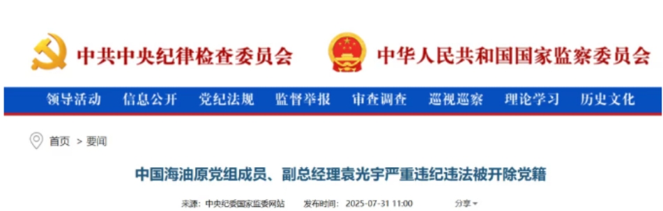 中央紀委國家監委網站訊 經中共中央批準,中央紀委國家監委對中國海洋石油集團有限公司原黨組成員、副總經理袁光宇嚴重違紀違法問題進行了立案審查調查。