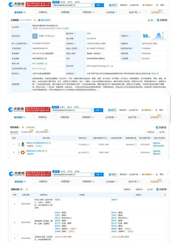 天眼查App顯示,近日,國家電投集團數字科技有限公司發生工商變更,何聯會卸任法定代表人、董事長,由朱曉東接任,同時注冊資本由約9.49億人民幣增至約15.57億人民幣。
