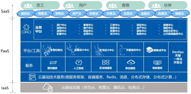 公司充分繼承原有的設(shè)計(jì)思想,從2018年開始研發(fā)基于微服務(wù)架構(gòu)、業(yè)務(wù)中臺(tái)的新一代企業(yè)管理系統(tǒng),并于2020年正式成立業(yè)務(wù)中臺(tái)部負(fù)責(zé)業(yè)務(wù)中臺(tái)研發(fā)與管理,已建成用戶中心、發(fā)票中心、報(bào)表中心、影像中心等多個(gè)業(yè)務(wù)中臺(tái)。應(yīng)用架構(gòu)圖如下: