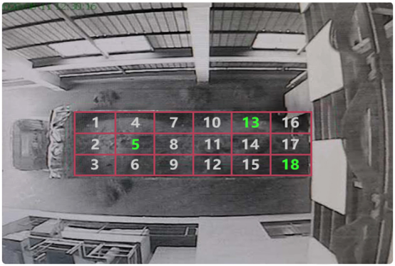實時顯示采樣區域,保證客觀真實通過攝像頭的實時畫面,基于深度學習物體檢測車輛,捕捉貨車車廂上頂蓋平面,用線條等分,繪制18個子采樣區域,并對子區域進行編號,直觀展示采樣分布。