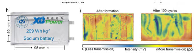 采用了萬龍精益導控Feli系列電池超聲波成像技術,在無負極鈉軟包電池化成和長期循環(huán)后,對其內部電解液浸潤和電解液分解產氣情況進行無損探測。從超聲成像結果可知,單溶劑高熵電解液在很大程度上抑制了氣體生成,也說明了同時實現(xiàn)高能量密度和高安全性的可行性。