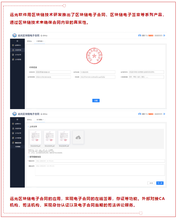 遠光軟件用區塊鏈技術研發推出了區塊鏈電子合同、區塊鏈電子簽章等系列產品,通過區塊鏈技術來確保合同內容的真實性。
