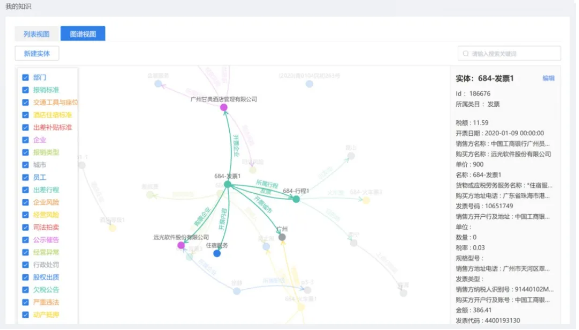 通過遠光軟件“知識圖譜應用平臺”的圖譜構建模塊,可以將審單過程中需要用到的各種實體融合到一張圖中,非常直觀的定義各類實體間的關系。再通過RPA或外部系統提供的數據接口,將實體所對應的具體數據導入,從而形成我們審單所需要的各類知識。單據中包含了哪些信息,哪些需要被重點關注,在圖中一目了然,真正做到了“哪里不清楚點哪里”。最后,將審單規則配置到圖譜中,就可以實現報銷單的自動審核。
