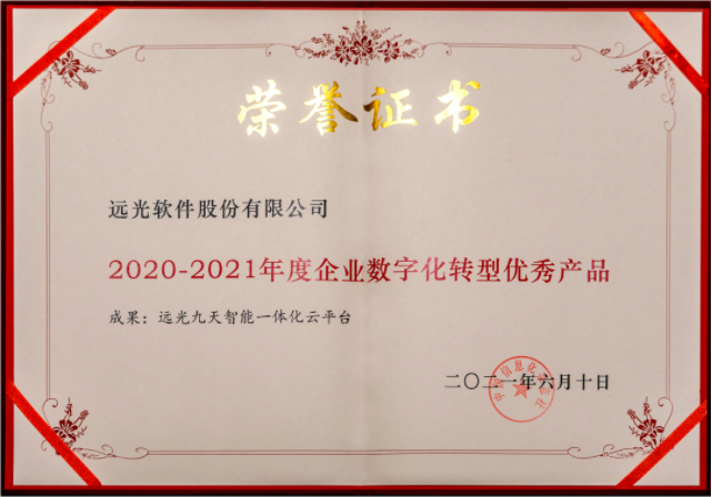 憑借強大的技術能力、協同創新能力和潛在應用價值,遠光九天平臺獲得了大會組委、活動評審和眾多企業、客戶的一致認可,獲選“2020-2021年度企業數字化轉型優秀產品”。