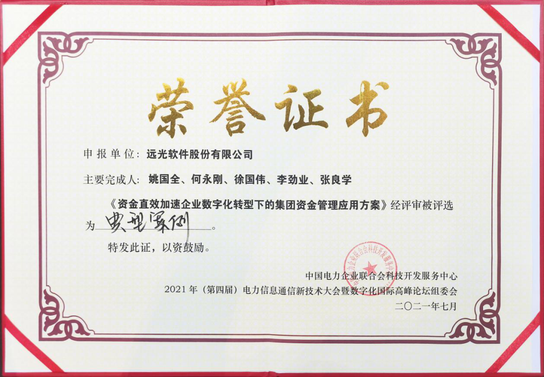 作為企業價值鏈管理的核心支撐,資金管理隨著企業數字化轉型的逐步推進,在集約化、精細化、智能化方面有了更迫切的需求。近日,遠光軟件“資金直效加速企業數字化轉型下的集團資金管理應用方案”(以下簡稱“集團資金管理應用方案”)憑借顯著的應用價值,被中國電力企業聯合會科技開發服務中心和2021年(第四屆)電力信息通信新技術大會暨數字化國際高峰論壇組委會聯合評選為電力企業數字化轉型典型案例。