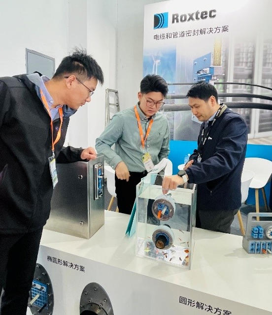 大批風(fēng)電設(shè)備制造商、開發(fā)商及技術(shù)專家蒞臨參觀。國內(nèi)某風(fēng)電整機(jī)廠技術(shù)專家表示:“以往項目中,不同規(guī)格管線要匹配不同密封件,選型、庫存管理都很繁瑣,Roxtec多徑技術(shù)直接解決了這個痛點,對提升安裝效率很有幫助。”