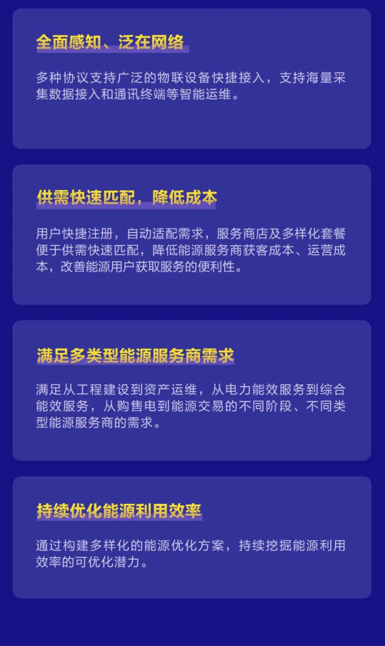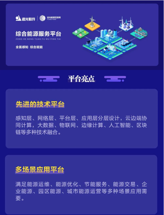 遠光綜合能源服務平臺是以物聯網為載體,以大數據、人工智能等技術為基礎,提供綜合能源供應、銷售、消費服務的綜合服務云平臺。平臺以能源用戶為中心,提供信息采集、能效分析、節能服務、需求響應、能源托管、能源交易等服務,為綜合能源服務商的客戶服務、業務創新、商業模式創新等提供支持。平臺可支撐企業綜合能源、園區綜合能源、智慧城市綜合能源運營。
