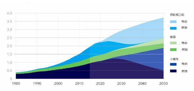 圖:全球不同類型和動力系統的路面交通工具數量統計(單位:百萬輛)