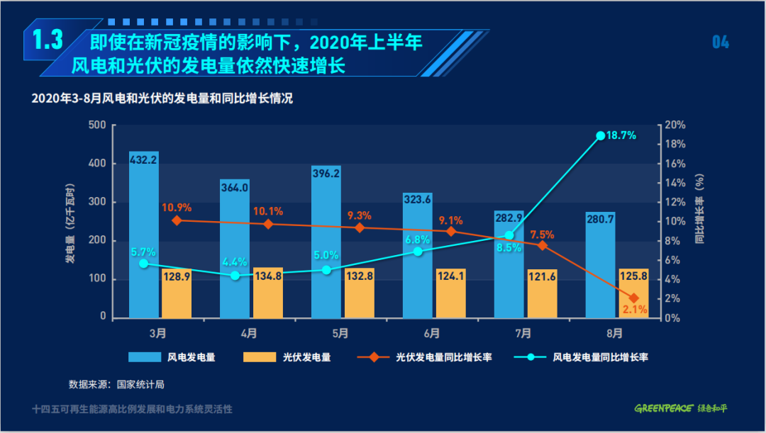 截至2019年底,全國(guó)非化石能源發(fā)電量為2.39萬(wàn)億千瓦時(shí),占全國(guó)發(fā)電量的32.6%,實(shí)現(xiàn)2030年非化石能源發(fā)電量占比50%的目標(biāo)已過(guò)半程。而即使是在2020年新冠疫情的壓力下,中央政府也沒(méi)有松懈綠色復(fù)蘇和轉(zhuǎn)型的決心,今年上半年風(fēng)電和光伏的發(fā)電量分別同比逆勢(shì)增長(zhǎng)了6.8%和9.1%。在已提前實(shí)現(xiàn)了“十三五”可再生能源裝機(jī)目標(biāo)之際,今年6月,國(guó)家發(fā)改委和能源局進(jìn)一步提高了目標(biāo),計(jì)劃今年內(nèi)風(fēng)電和光伏發(fā)電裝機(jī)均達(dá)到240吉瓦左右。