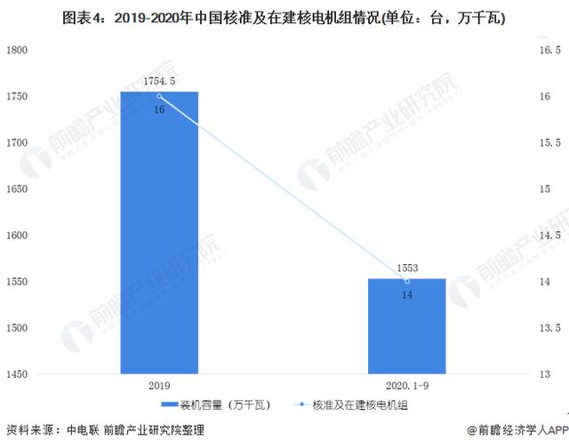 根據中電聯的數據顯示,截至2019年底,我國核準及在建核電機組16臺,裝機容量1754.5萬千瓦,位居世界第一。而截止到2020年9月底,在建核電機組14臺,總裝機容量1553萬千瓦。