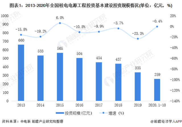 受到福島核電站等事故的影響,我國核電建設雖然處在高速發展期,但是保持著以“穩”為主的基調,新開工機組數量較少,核電工程投資額有所下滑。根據中國電力企業聯合會的統計數據顯示,2020年1-10月,全國主要核電企業電源工程完成投資259億元,同比下降0.4%。