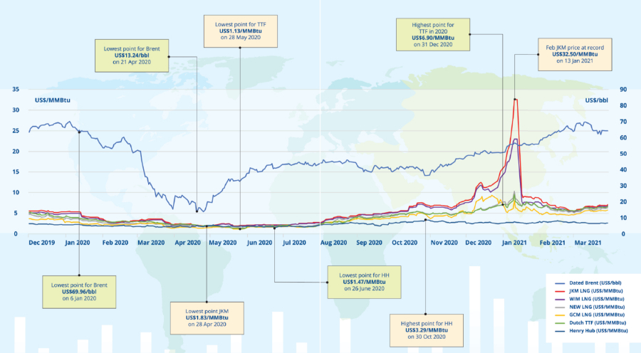 受疫情影響,2020年全球油氣供需嚴重失調,不僅WTI創造了歷史性的“負油價”,全球天然氣價格也緊隨其后,降至近十年來最低點。一直飽受“亞洲溢價”困擾的JKM定價與同期歐美氣價幾乎持平,最低至1.83美元/MMBtu。