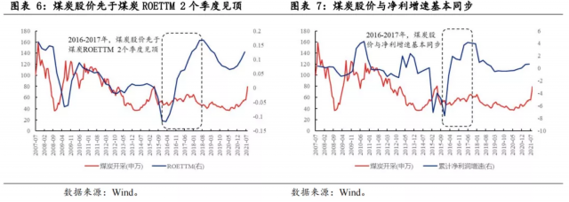 供給壓縮主導的煤炭價格上漲,股價與基本面相關性更高,累計凈利增速可能是更重要的觀測變量。2016-2017年煤炭股價的上漲與基本面基本同步,從時間維度來看,那輪行情中,煤炭股價提前于煤炭股ROE 2個季度見頂,2017年三季度至2018年三季度,煤炭股ROE持續上漲,但煤炭股價相對全A收益率卻為-6.14%。與之形成對比的是,2017年三季度煤炭股凈利潤增速與煤炭股價同步見頂,隨后的一年內雖保持在70%以上的高位,但煤炭股價依舊下滑。