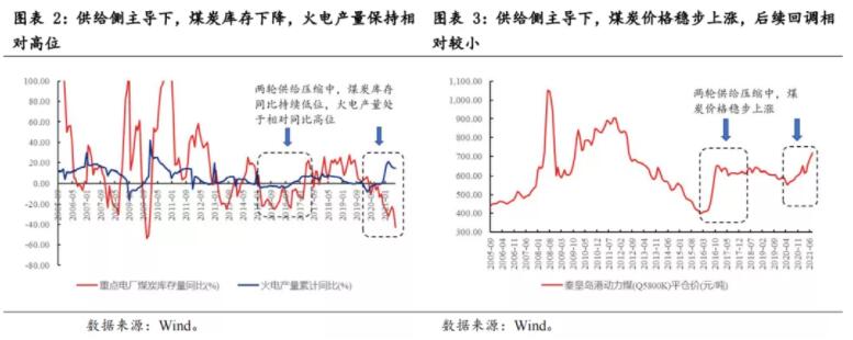 2008年以來,共有三輪煤炭價格持續上漲區間,第一輪的上漲動力是中國四萬億刺激政策落地,流動性和需求主導,第二輪為供給側改革,供給壓縮主導,第三輪為需求復蘇+供給壓縮主導。