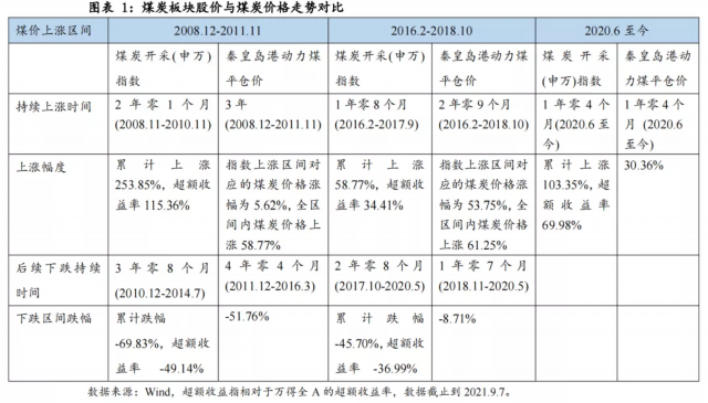 如果我們用歷史的經驗來看,本輪煤炭股凈利增速的高點應當與煤炭股高點相同,那么從已有的預測數據推斷,煤炭股價的高點可能在三季度或四季度出現,但是碳中和背景下,本輪煤炭股供給側的邏輯更強,部分煤炭股還具有新能源的邏輯,這都有可能拉長煤炭股表現的時間。