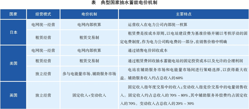 現階段,日本抽水蓄能電站主要采用租賃制(電源開發商參與)和內部核算制(電力公司主導);美國則以電網統一運營模式為主(抽蓄電站約占70%),輔以租賃運營和少量獨立運營,直接參與電力市場的比例較低;英國抽水蓄能電站雖然總體規模有限,但其高度市場化的發電側環境使其能夠作為獨立成員參與市場,其收入明確區分為年度交易的固定收入與競價交易的變動收入兩部分,構成典型的兩部制電價模式(見表)。