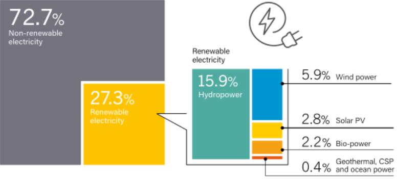 2020年版REN21《全球再生能源現(xiàn)況報告》中的“全球電力生產(chǎn)的再生能源份額”。