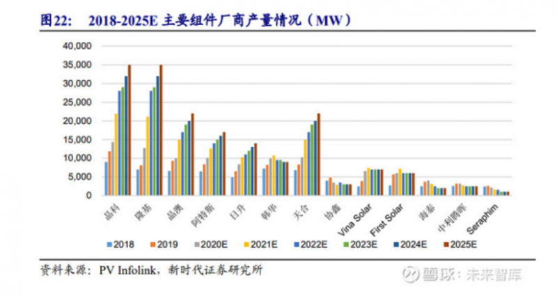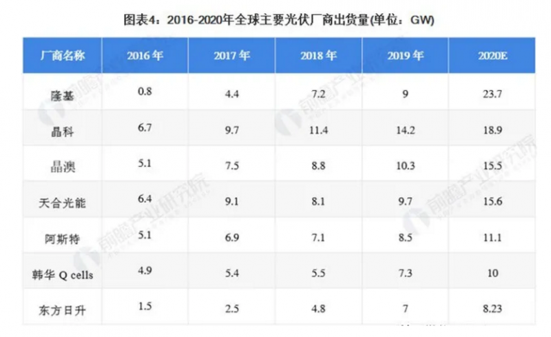 圖表2:我國光伏組件發展階段2016-2020年,全球主要廠商的組件出貨量不斷提升。2020年,隆基股份組件出貨量約為23.7GW,同比2019年增長163.33%,躍升至行業首位。同時,晶科、晶澳等龍頭組件廠商的出貨量也實現了超過30%的增長。廠商擴張產能主要為滿足下游光伏裝機容量的增加。