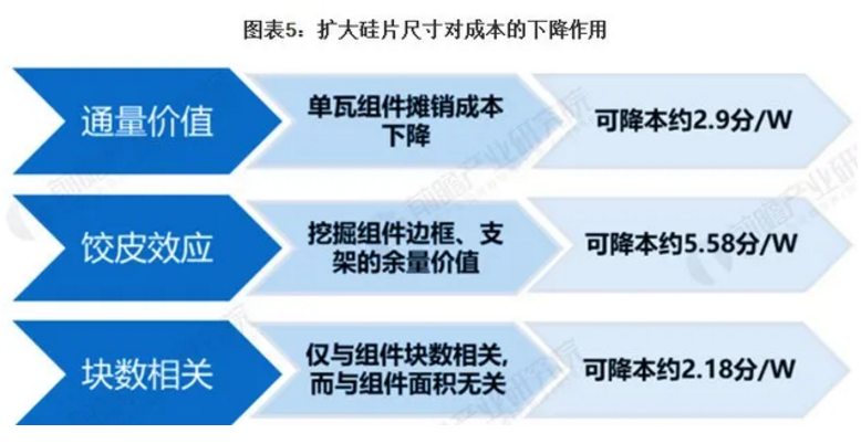 隨著硅片尺寸的擴大,新型組件可以通過增加少量的硅片成本,獲得更高的組件端成本節約,進而提升大尺寸組件的產品競爭力。其降本機理為: