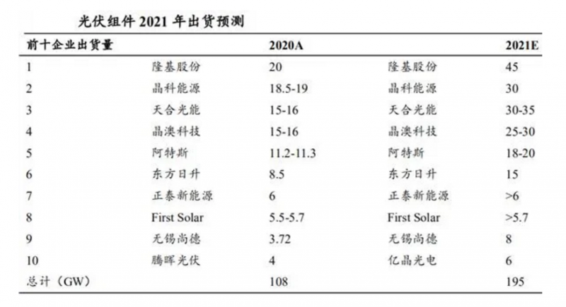 全球組件產能擴張迅速。據預測,2021 年全球光伏裝機量預計在 160~170GW 左右,以 1:1.2 容配比計算,對應的組件總需求預計約為 192~204GW, 這意味著頭部企業的市占率目標將超過 90%。根據 BNEF 數據,2020 年全球 Tier 1 組件產能約為 220GW,同比增長 31.7%。根據 PV Infolink 及公司公告數據統計, 2021 年組件廠商產能預計約為 300GW,同比+33.76%,各家產能擴張迅速。