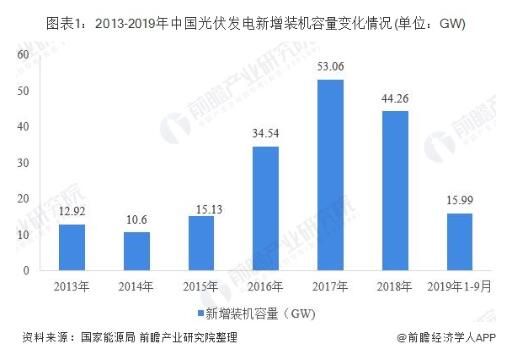 我國太陽能光伏行業雖起步較晚,但發展迅速,尤其是2013年以來,在國家及各地區的政策驅動下,太陽能光伏發電在我國呈現爆發式增長,據國家能源局統計數據顯示,2017年,我國光伏發電新增裝機容量為53.06GW,創歷史新高,2018年,受光伏531新政影響,各地光伏發電新增項目有所下滑,全年新增裝機容量為44.26GW,同比下降16.6%。截至2019年9月底,全國光伏發電新增裝機15.99GW。