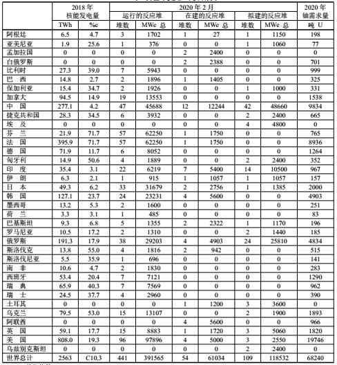 本數據是世界核能協會(World Nuclear Association,WNA)于 2020年2月份提供的數據。