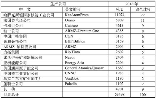 隨著哈薩克斯坦的跨國所有權結構再次多元化。超過一半的鈾礦生產來自國有礦業公司,其中一些公司將安全供應置于市場考慮之上,全球總產量約有下降。2018年,全球前十大鈾生產公司銷售了全球80%的鈾產量:
