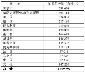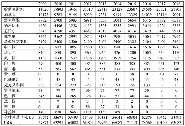 本數據是世界核能協會(WNA)于 2019年8月份提供的從鈾礦生產(公噸U)的數據。