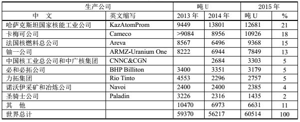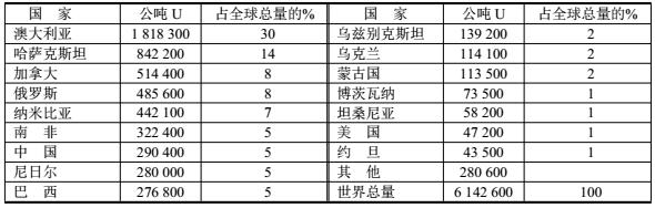 世界約76%從鈾礦生產的鈾是來自哈薩克斯坦、加拿大、澳大利亞和納米比亞。其中哈薩克斯坦鈾生產占世界的比例最大,供應世界的40.6%,其次是加拿大(13.1%)和澳大利亞(12.2%)。中國鈾產量較少,鈾生產居世界第8位,占世界總量的3.5%。